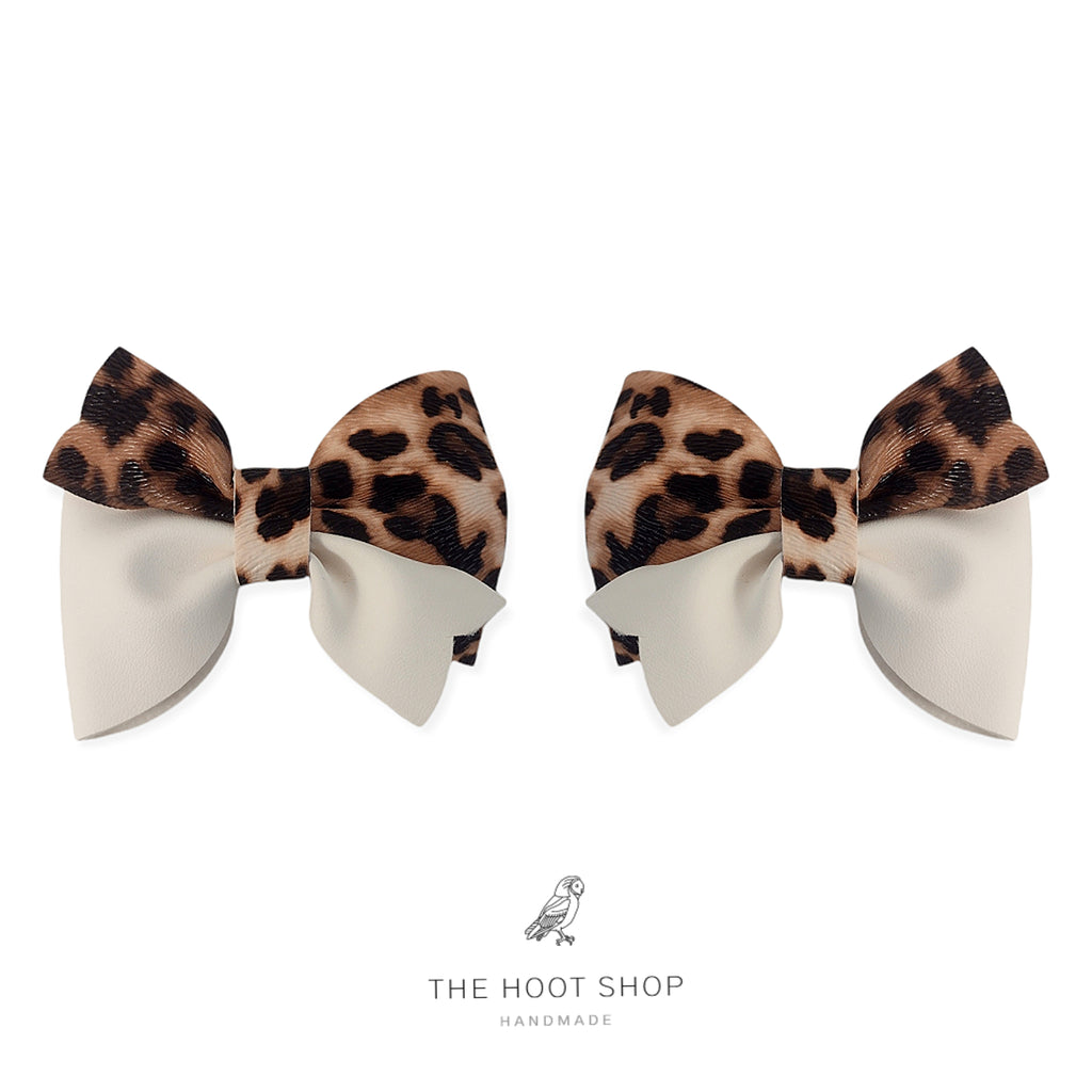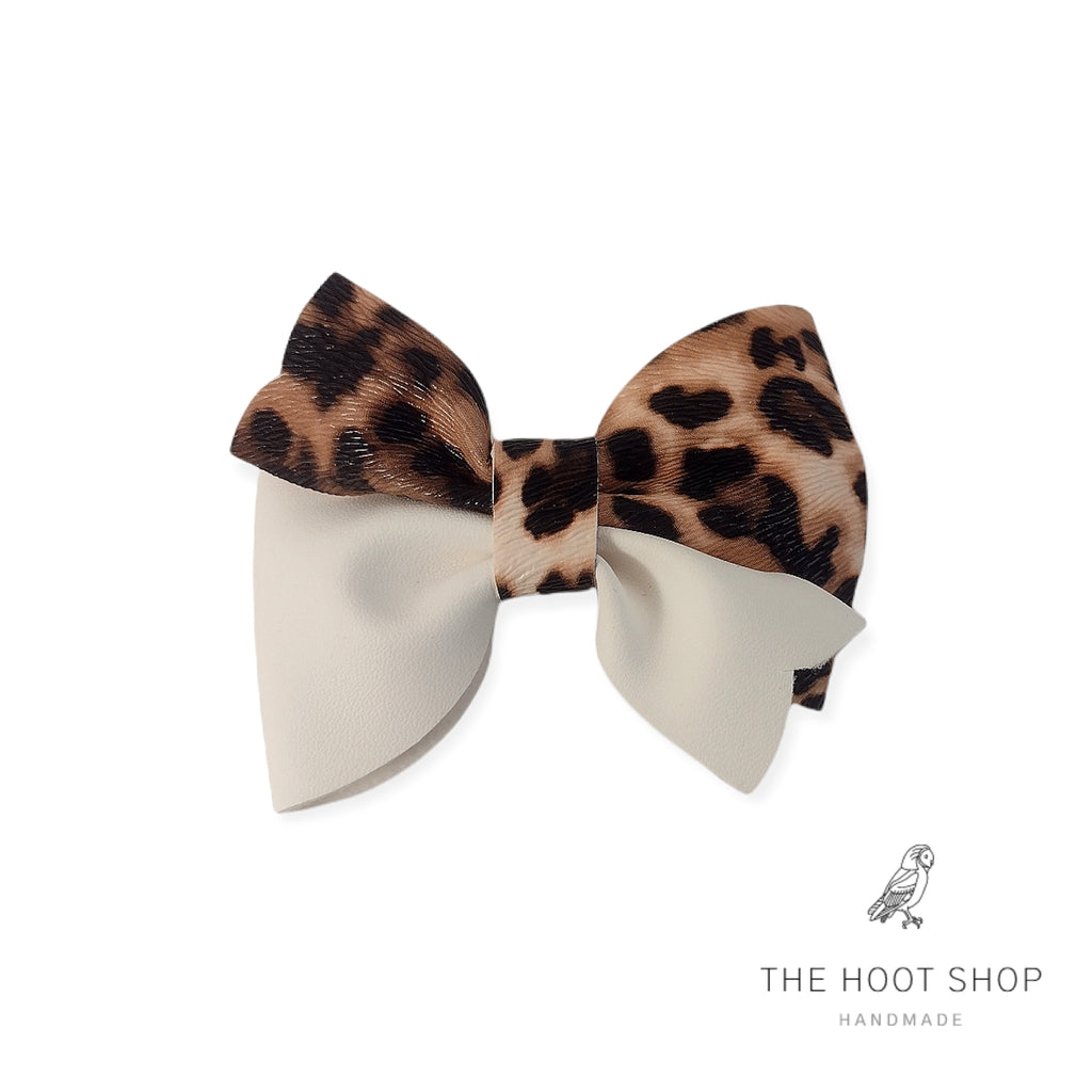3" Layla Style Pinch Bow with Overlaying Tails in Leopard Print Textured Leather and White Jelly Smooth Textured Leather choose between a Single or Pigtail Set, attached to a Silver Alligator Clip.
