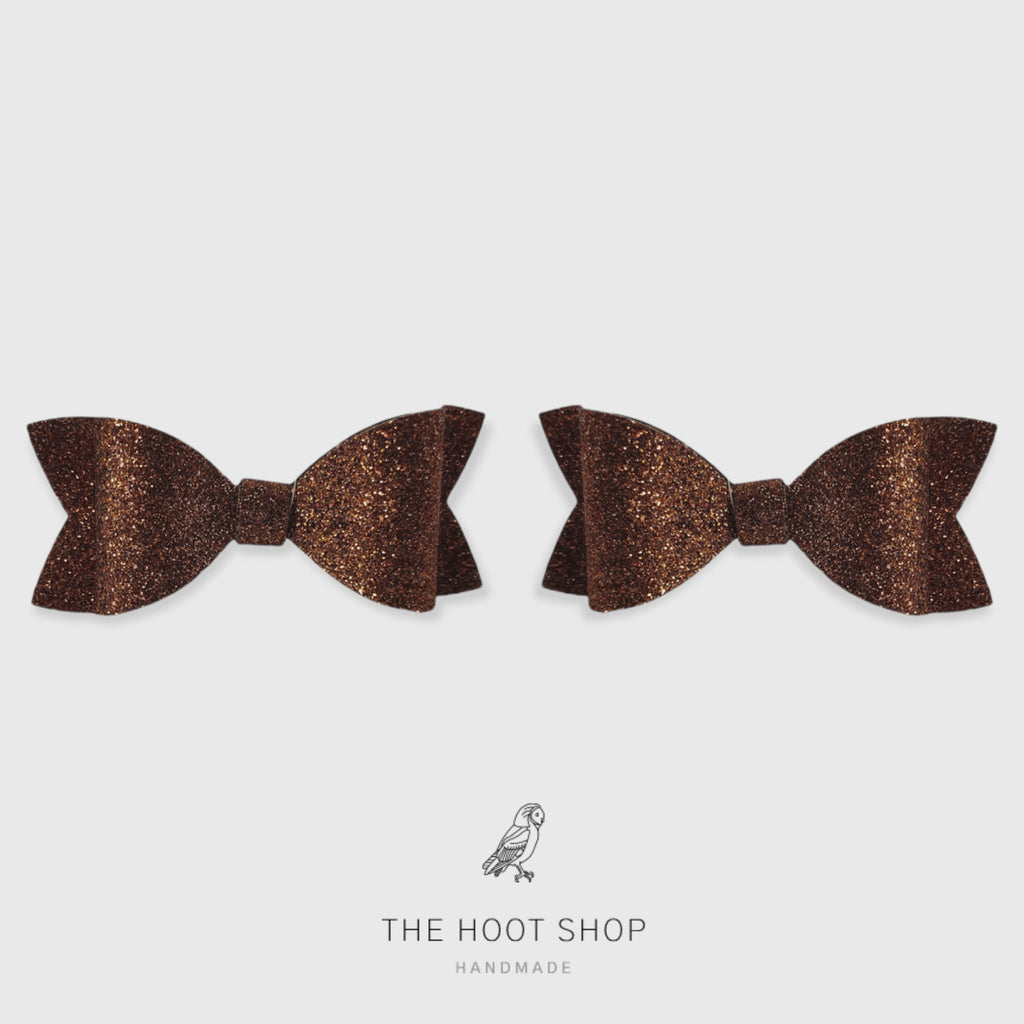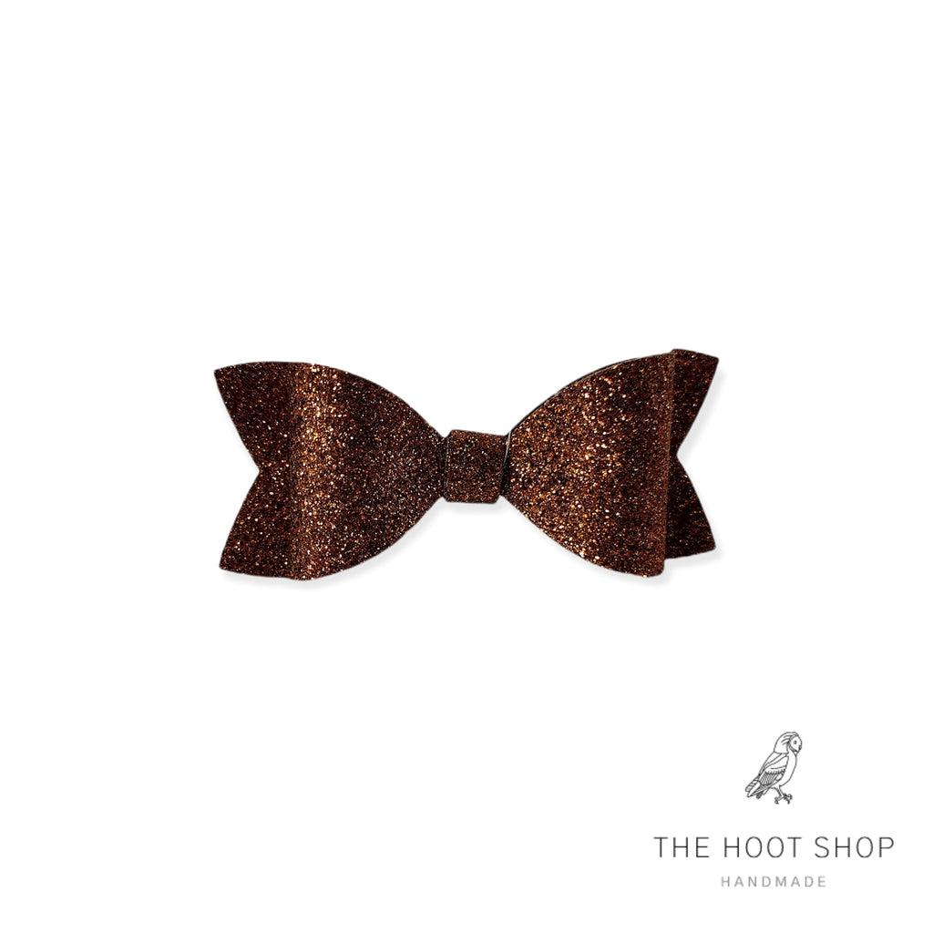Bitty Style Bow in Mahogany Brown Fine Glitter Textured Leather Bow, attached to Silver Alligator Clip.